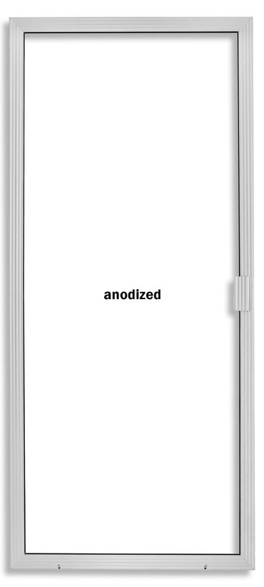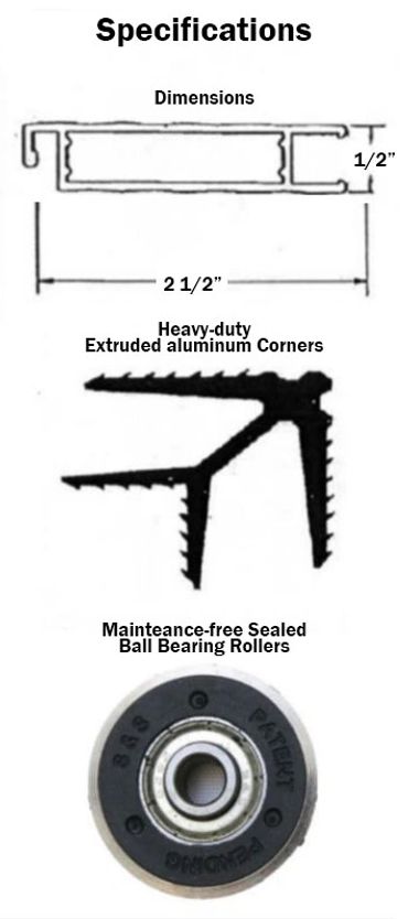 The heavy-duty sculpted frame is constructed of 2-1/2" x 1/2" extruded aluminum and has extruded spur corners so it is guaranteed to be rugged. The top wheels are steel tension wheels and the bottom wheels are maintenance free sealed ball bearing rollers to ensure a smooth glide for many years to come.